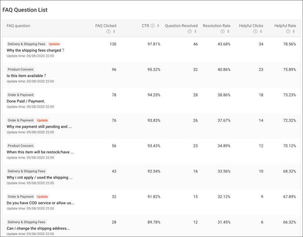 Por ejemplo: cuando una pregunta tiene un bajo CTR pero una alta Tasa de resolución, quiere decir que debes reformular la pregunta frecuente, ya que aunque los usuarios pocas veces la usan, esa pregunta frecuente ayudó a solucionar la duda de un cliente.
